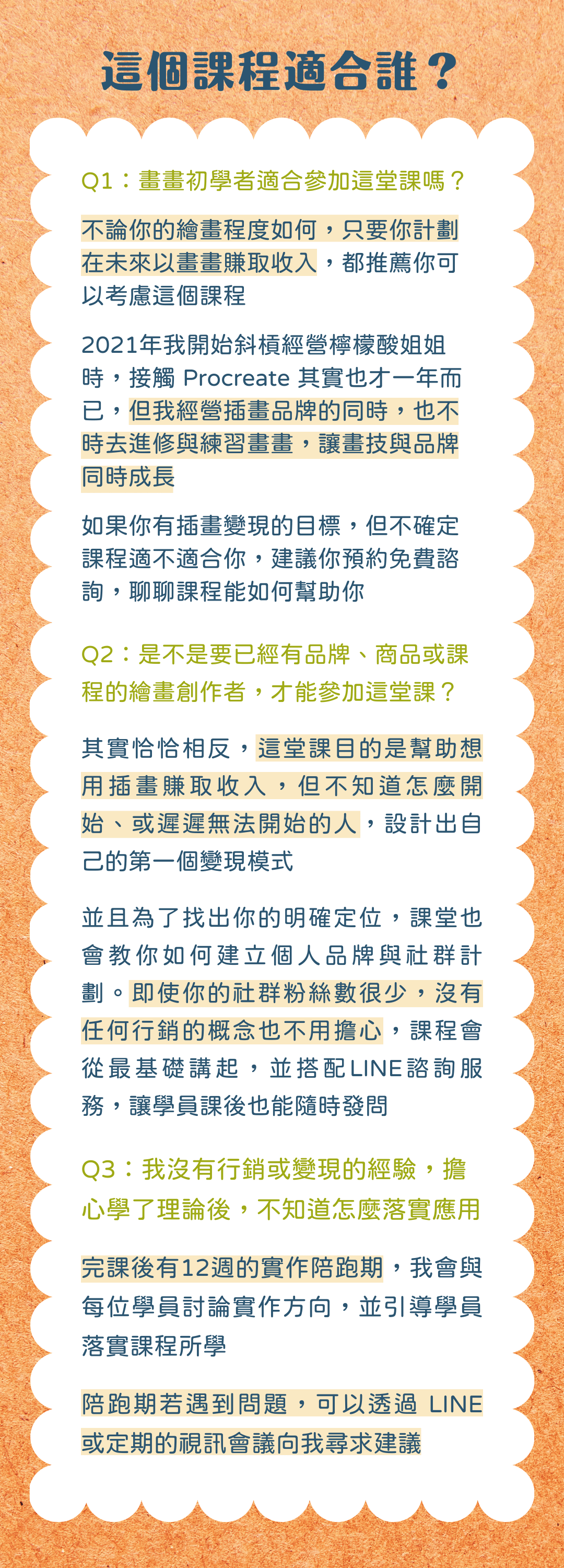 雖然這堂課是為斜槓者設計,但其中許多創業知識及商業模式,也適用於全職插畫家。建議可以預約一對一免費諮詢,聊聊你的狀況,這樣可以更準確地評估這堂課可以怎麼幫助你