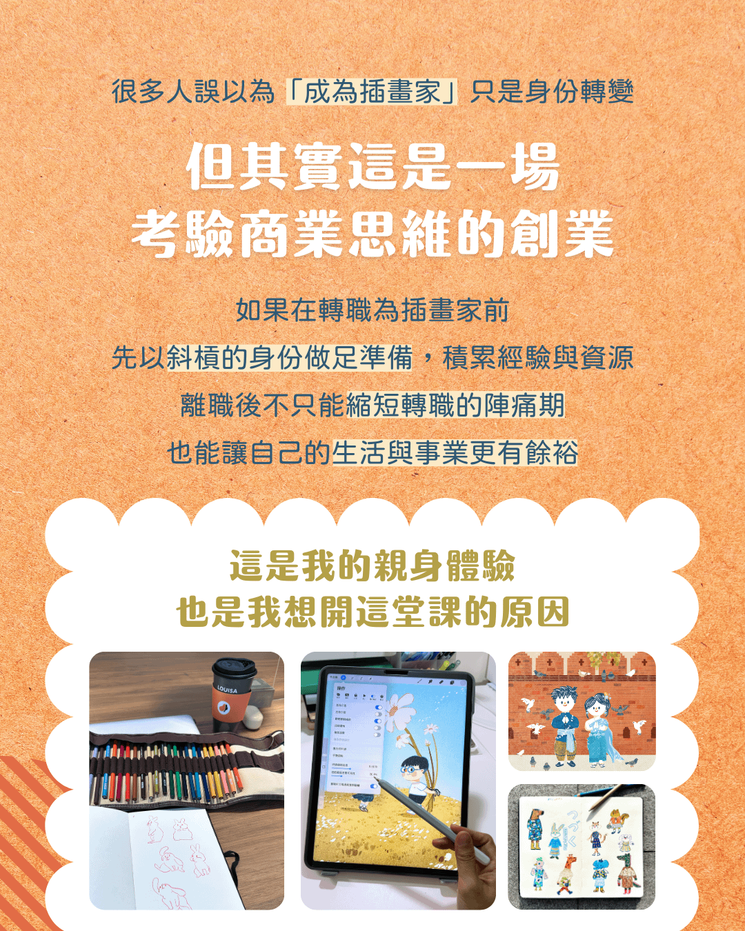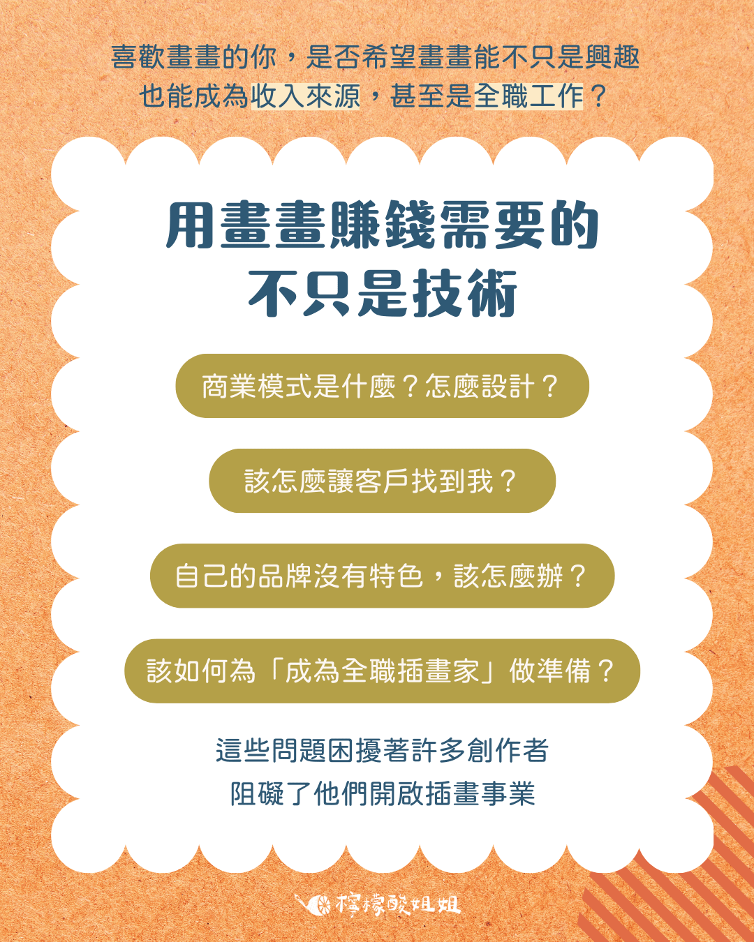 其實恰恰相反,這堂課目的是幫助想用插畫賺取收入,但不知道怎麼開始、或遲遲無法開始的人,設計出自己的第一個變現模式